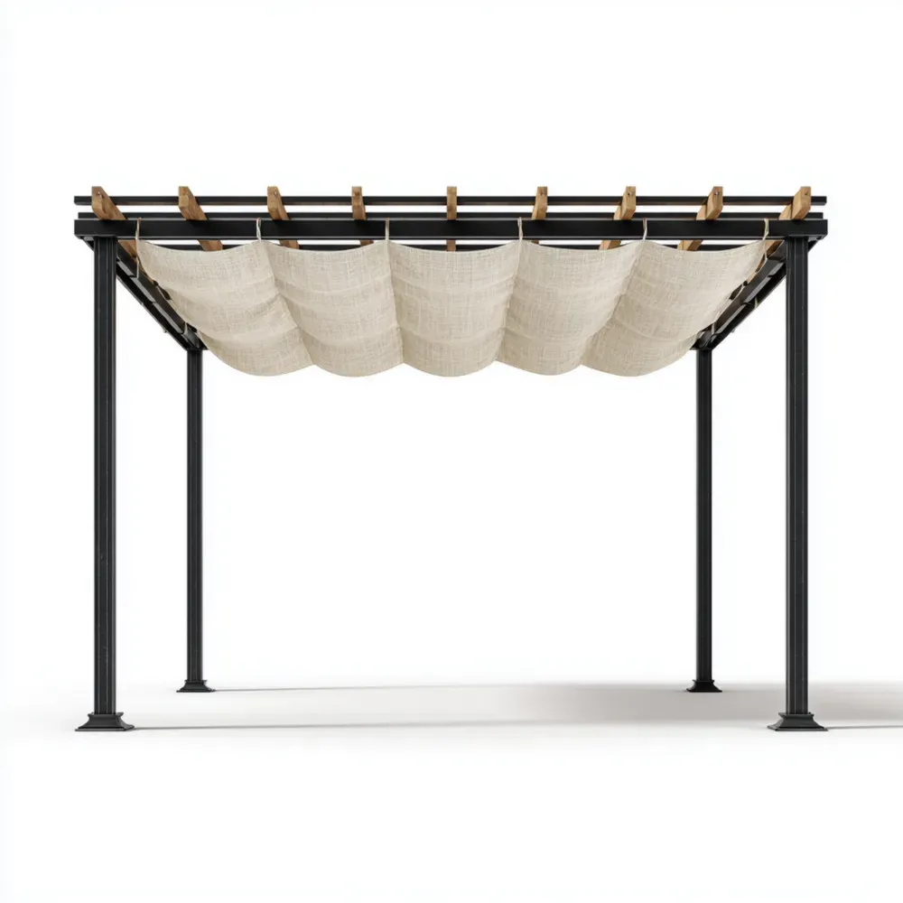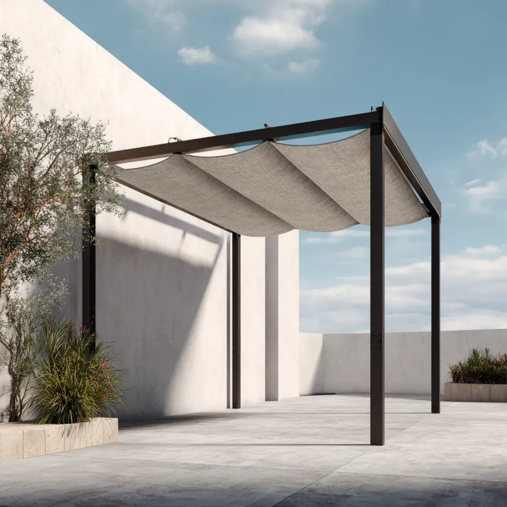 Pergola mit Metallrahmen und Stoffdach in Grau