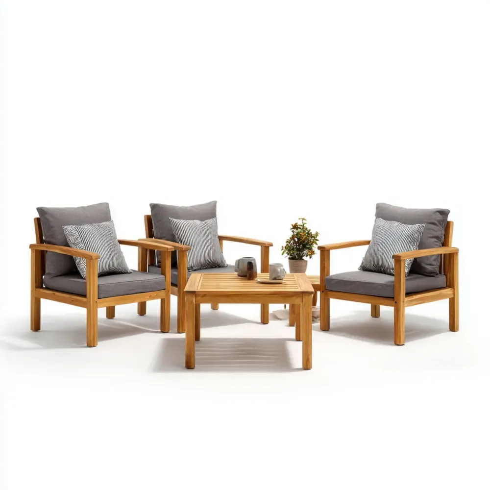 Dieses Gartenmöbel-Set besteht aus Teakholz und ist für den Außenbereich geeignet. Die Sitz- und Rückenkissen sind aus grauem Polyester gefertigt.