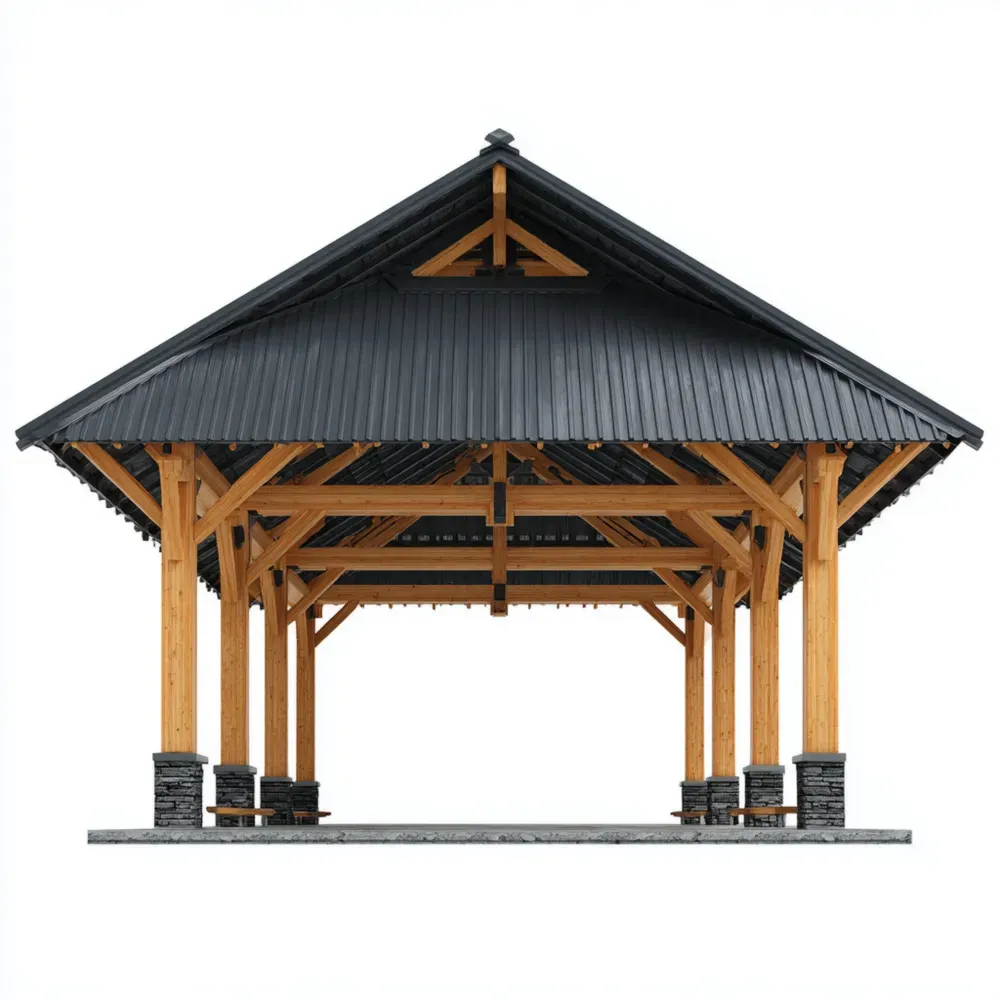 Der geräumige Gartenpavillon besteht aus Fichtenholz mit robusten Stahlverstrebungen. Das Dach ist aus verzinktem Stahl gefertigt. Diese Kombination bietet Stabilität und Langlebigkeit.