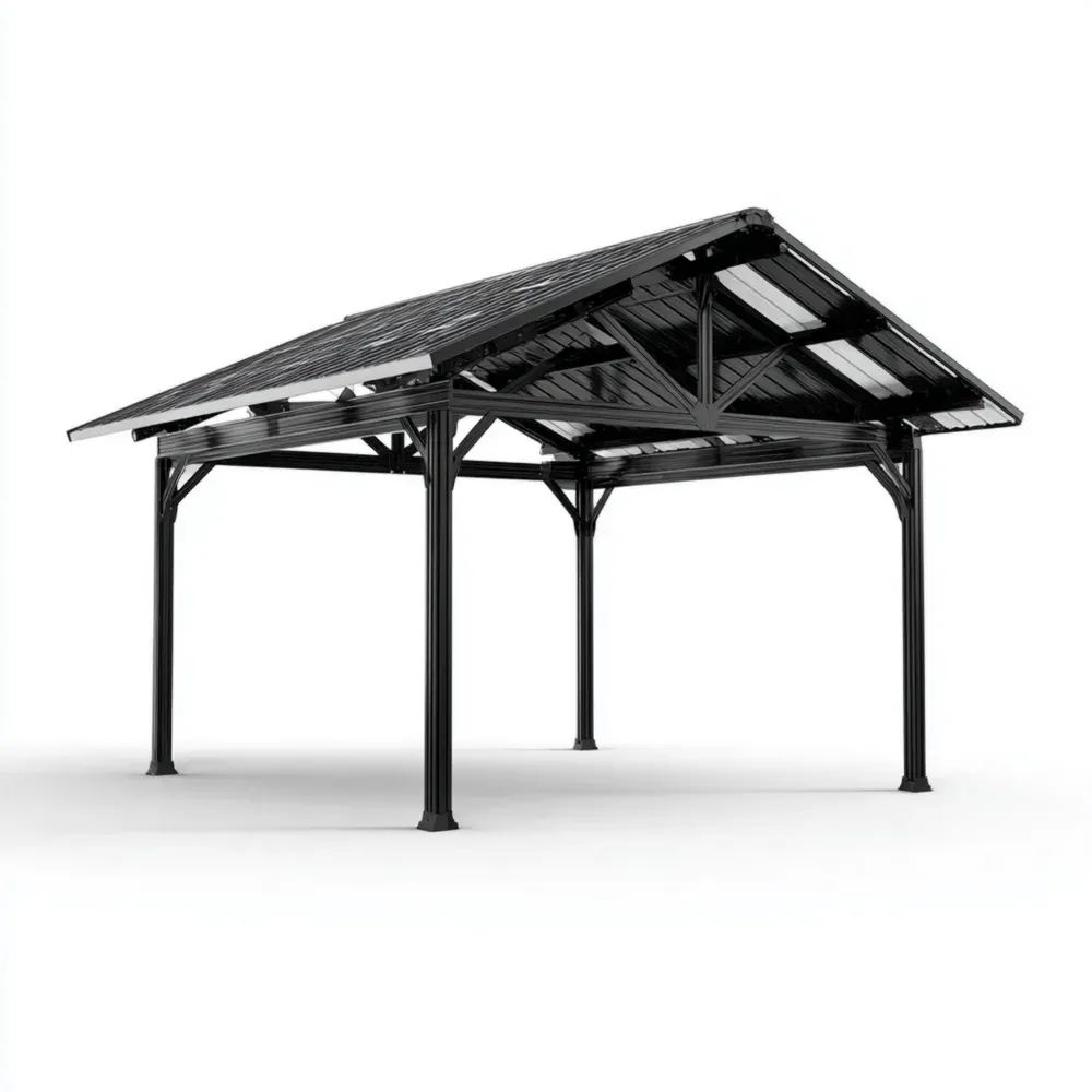 Dieser Gartenpavillon besteht aus pulverbeschichtetem Aluminium und verfügt über ein Dach aus 6 mm starken Polycarbonat-Platten in Schwarz. Das robuste Design bietet optimalen Schutz vor Sonne und Regen im Außenbereich.