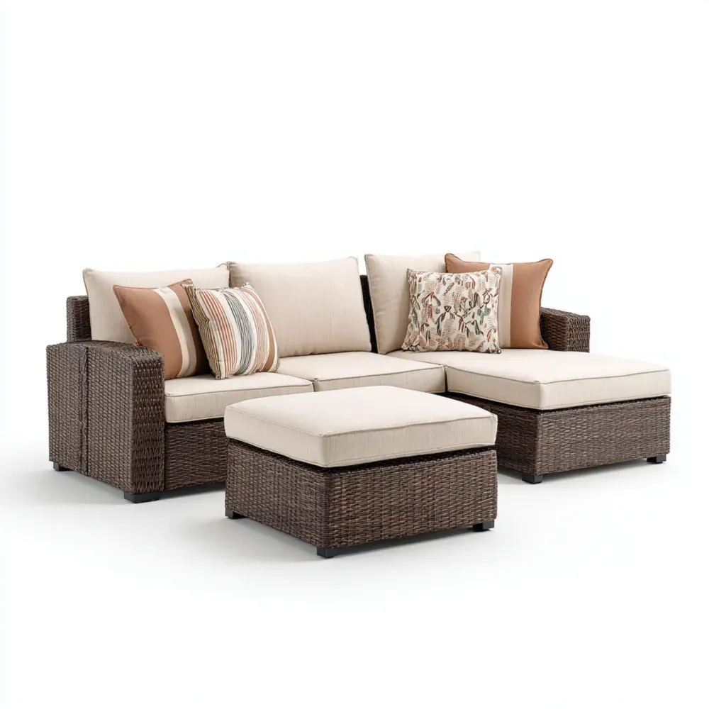 Dieses Ecksofa-Set aus Polyrattan eignet sich für den Außenbereich. Es besteht aus braunem Polyrattan mit beigen Polyesterkissen.